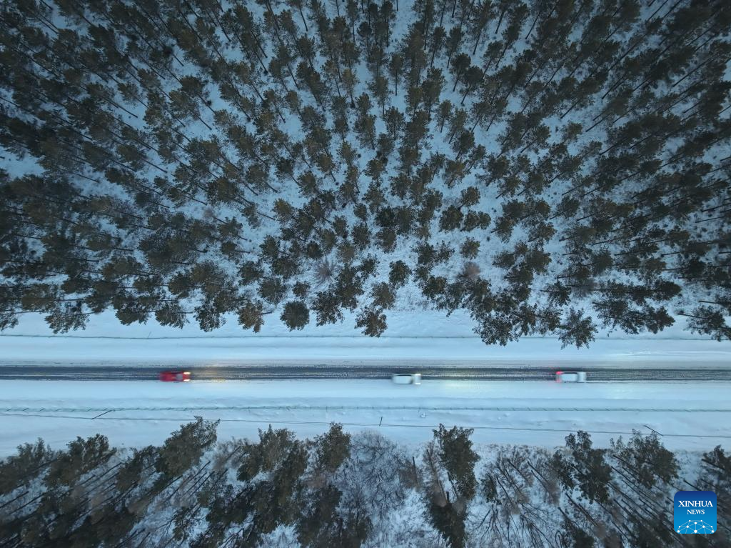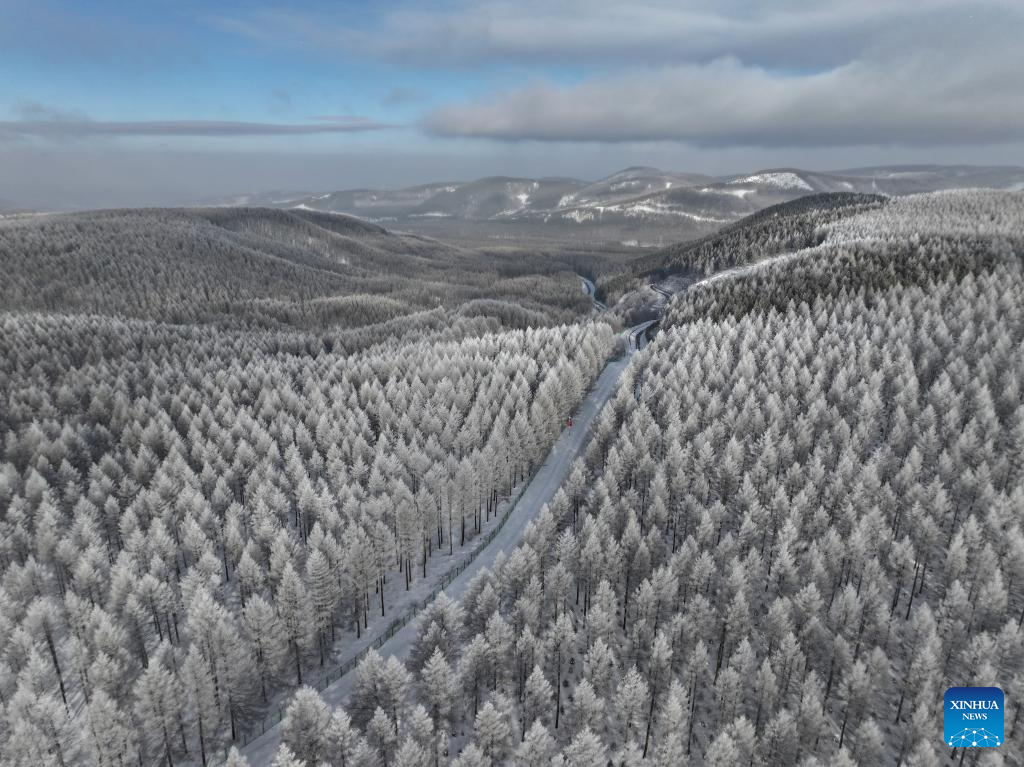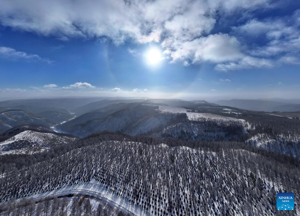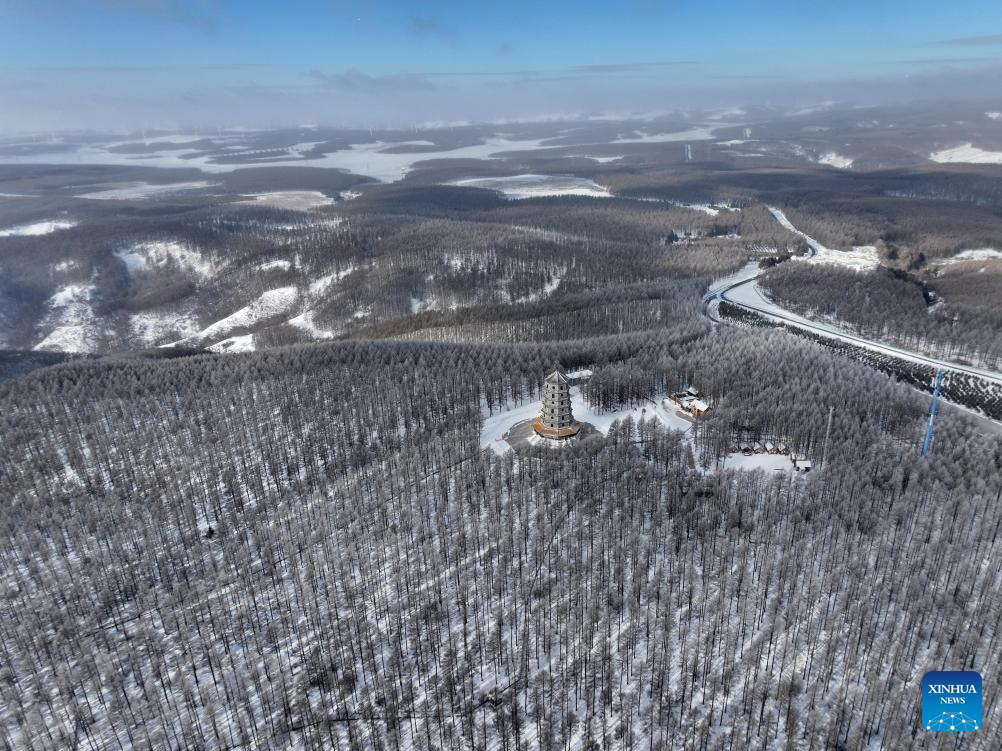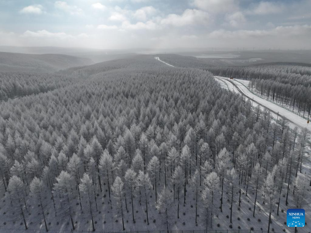 An aerial drone photo taken on Dec. 27, 2024 shows a winter view of the Saihanba National Forest Park in Chengde City, north China's Hebei Province. (Xinhua/Mu Yu)