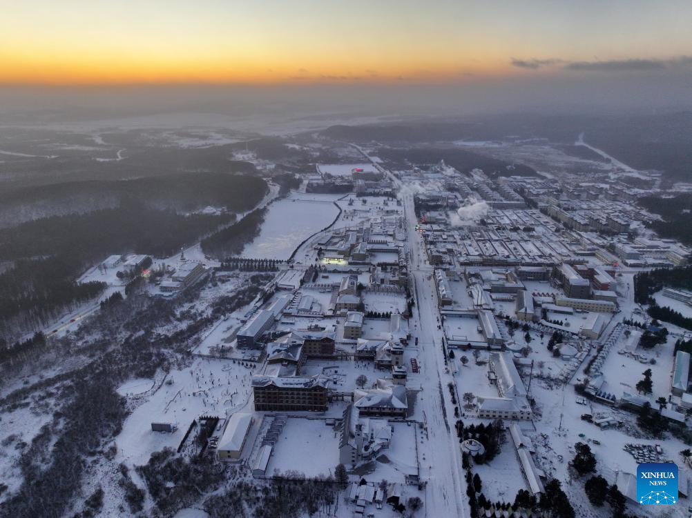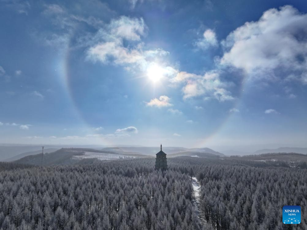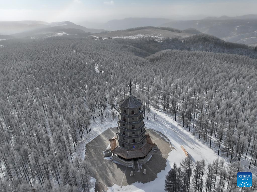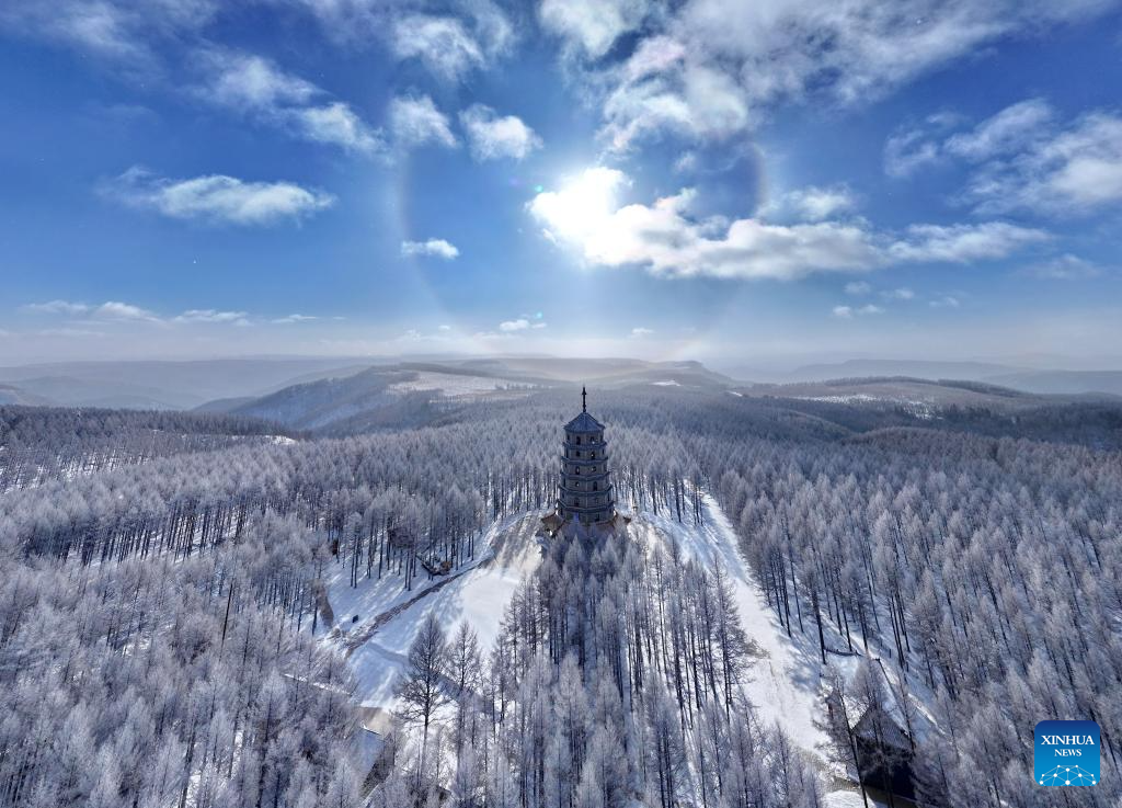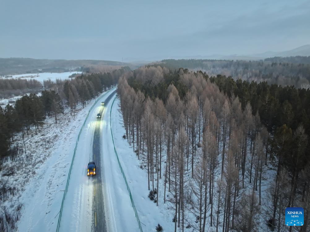 An aerial drone photo taken on Dec. 27, 2024 shows a winter view of the Saihanba National Forest Park in Chengde City, north China's Hebei Province. (Xinhua/Mu Yu)