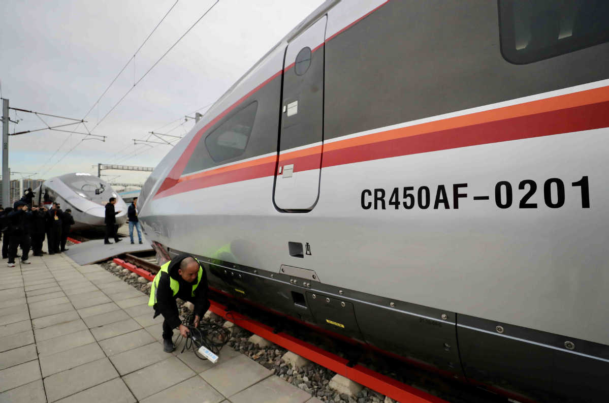 The CR450 high-speed train prototype, with a test speed of up to 450 kilometers per hour and an operational speed of 400 km/h, was officially unveiled in Beijing on Sunday, highlighting China's cutting-edge advancements in rail technology. Once it enters commercial service, the CR450 will become the fastest high-speed train in the world to operate commercially. China's fastest high-speed train now operates at the speed of 350 km/h.