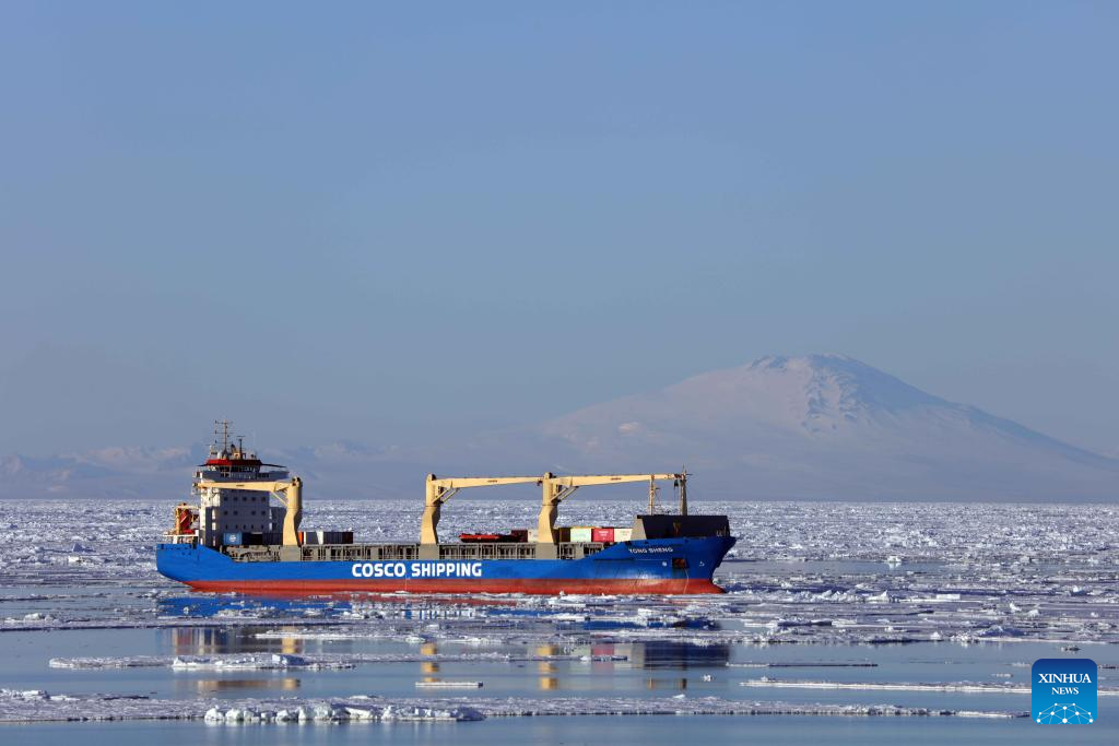 Chinese cargo vessel Yong Sheng sails in the sea on Dec. 24, 2024. Chinese research icebreaker Xuelong 2, or Snow Dragon 2, and cargo vessel Yong Sheng, which are on China's 41st Antarctic expedition, arrived at China's Qinling Station in Antarctica on Dec. 25 and carried out unloading operations. (Xinhua/Huang Taoming)