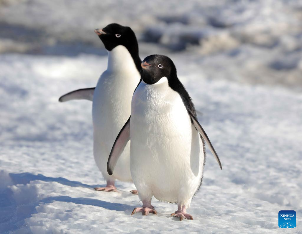 This photo taken on Dec. 27, 2024 shows penguins near China's Qinling Station in Antarctica. Chinese research icebreaker Xuelong 2, or Snow Dragon 2, and cargo vessel Yong Sheng, which are on China's 41st Antarctic expedition, arrived at China's Qinling Station in Antarctica on Dec. 25 and carried out unloading operations. (Xinhua/Huang Taoming)
