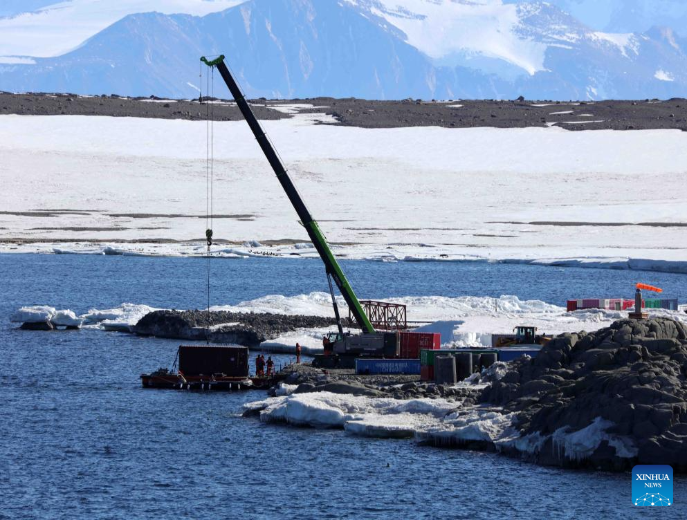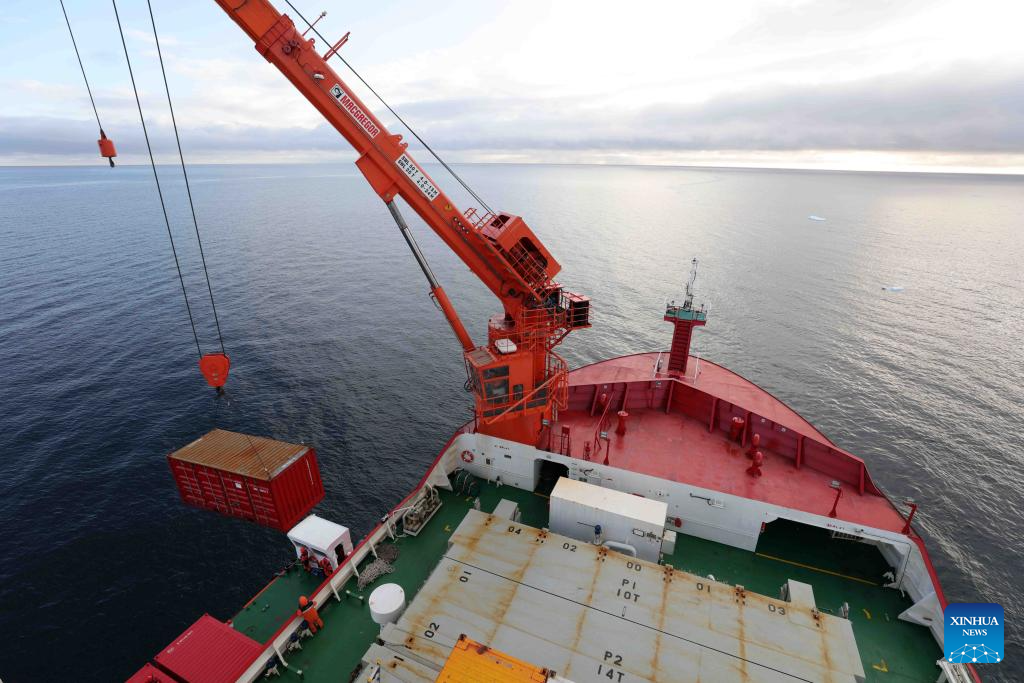 Chinese research icebreaker Xuelong 2, or Snow Dragon 2, unloads materials near China's Qinling Station in Antarctica on Dec. 27, 2024. Chinese research icebreaker Xuelong 2, or Snow Dragon 2, and cargo vessel Yong Sheng, which are on China's 41st Antarctic expedition, arrived at China's Qinling Station in Antarctica on Dec. 25 and carried out unloading operations. (Xinhua/Huang Taoming)