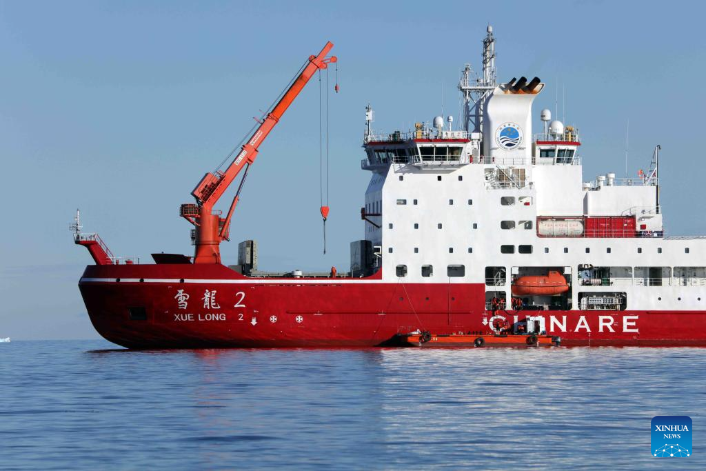 Chinese research icebreaker Xuelong 2, or Snow Dragon 2, is pictured near China's Qinling Station in Antarctica on Dec. 27, 2024. Chinese research icebreaker Xuelong 2, or Snow Dragon 2, and cargo vessel Yong Sheng, which are on China's 41st Antarctic expedition, arrived at China's Qinling Station in Antarctica on Dec. 25 and carried out unloading operations. (Xinhua/Huang Taoming)