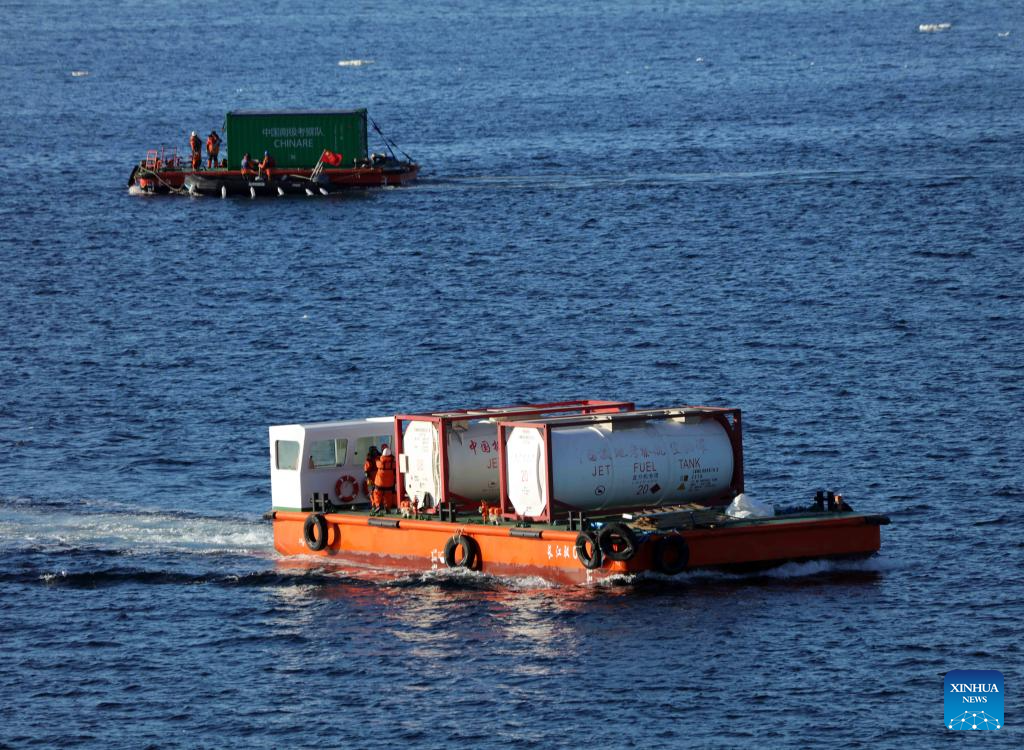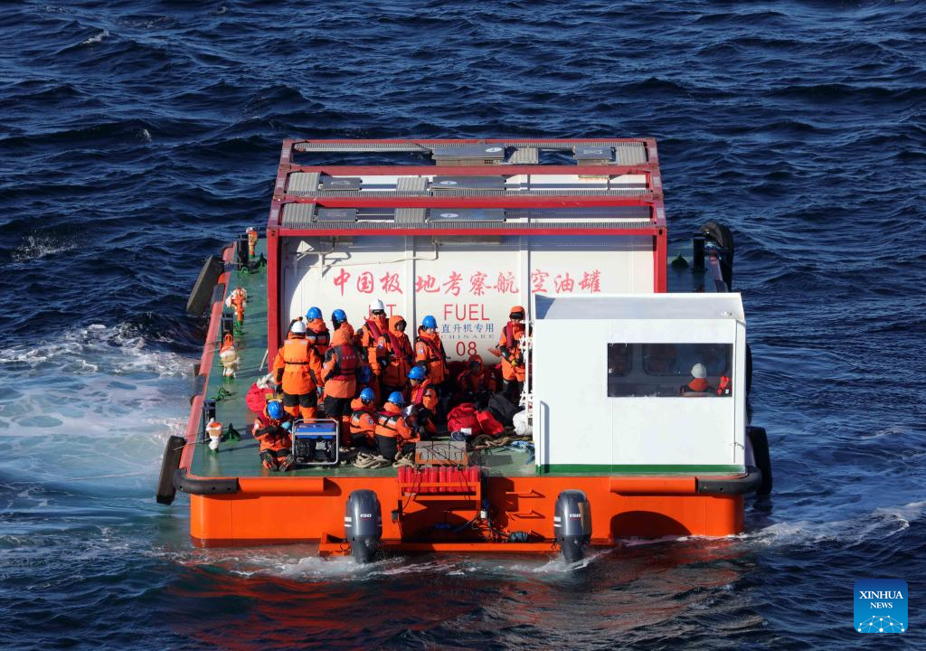 Members of China's 41st Antarctic expedition team are pictured on a barge while transporting supplies to China's Qinling Station in Antarctica on Dec. 25, 2024. Chinese research icebreaker Xuelong 2, or Snow Dragon 2, and cargo vessel Yong Sheng, which are on China's 41st Antarctic expedition, arrived at China's Qinling Station in Antarctica on Dec. 25 and carried out unloading operations. (Xinhua/Huang Taoming)