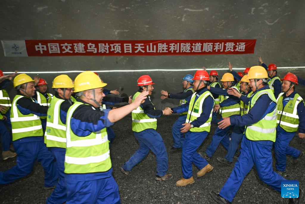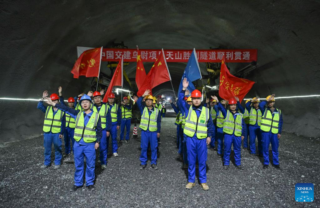 This photo taken on Dec. 30, 2024 shows a ceremony held to mark the drill-through of the Tianshan Shengli Tunnel along the Urumqi-Yuli Expressway in northwest China's Xinjiang Uygur Autonomous Region. The Tianshan Shengli Tunnel, the world's longest expressway tunnel, completed tunneling Monday morning, paving the way for the opening of a new shortcut linking southern and northern parts of China's Xinjiang Uygur Autonomous Region. (Xinhua/Hu Huhu)