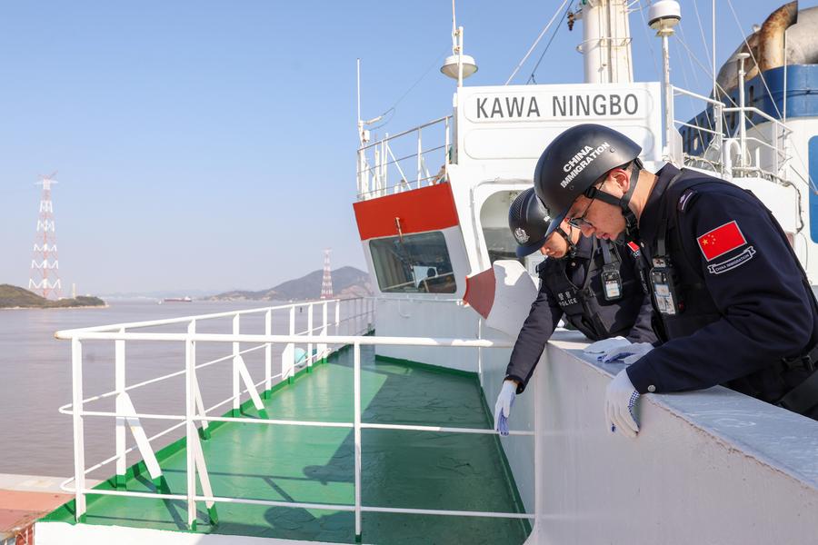 Immigration administration police officers conduct security check aboard Kawa Ningbo, the first cargo ship that will sail on the Ningbo-Wilhelmshaven direct route, at Ningbo Zhoushan Port in Ningbo, east China's Zhejiang Province, Dec. 30, 2024. (Xinhua/Jiang Han)