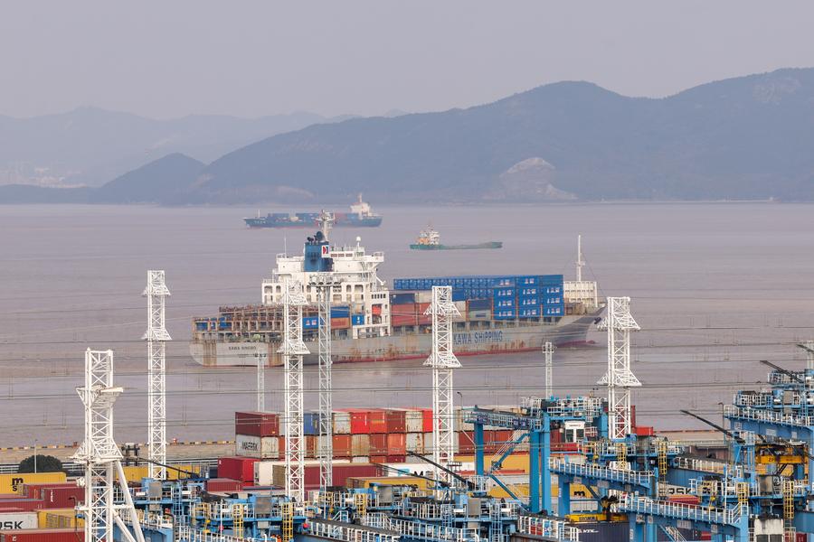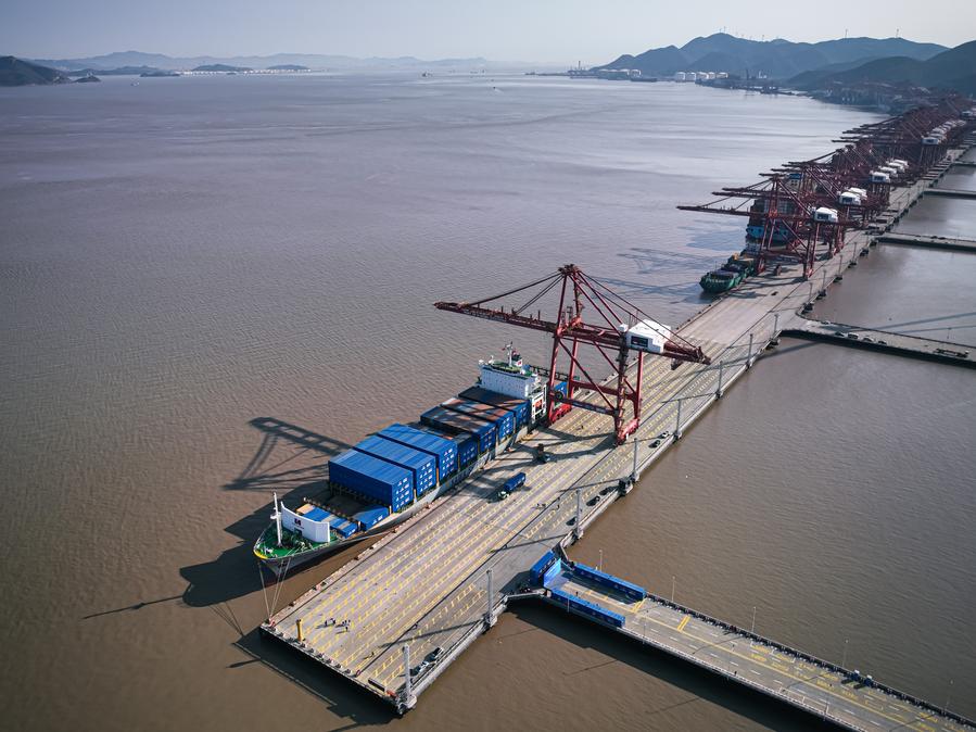 This aerial drone photo shows Kawa Ningbo, the first cargo ship that will sail on the Ningbo-Wilhelmshaven direct route, docking at Ningbo Zhoushan Port in Ningbo, east China's Zhejiang Province, Dec. 30, 2024. (Xinhua/Jiang Han)