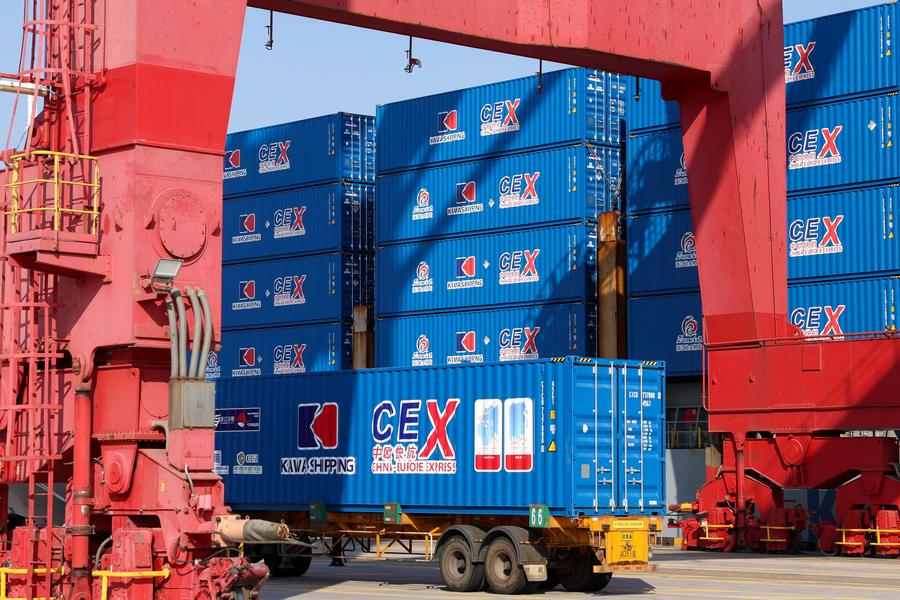 Containers are loaded onto Kawa Ningbo, the first cargo ship that will sail on the Ningbo-Wilhelmshaven direct route, at Ningbo Zhoushan Port in Ningbo, east China's Zhejiang Province, Dec. 30, 2024. (Xinhua/Jiang Han)