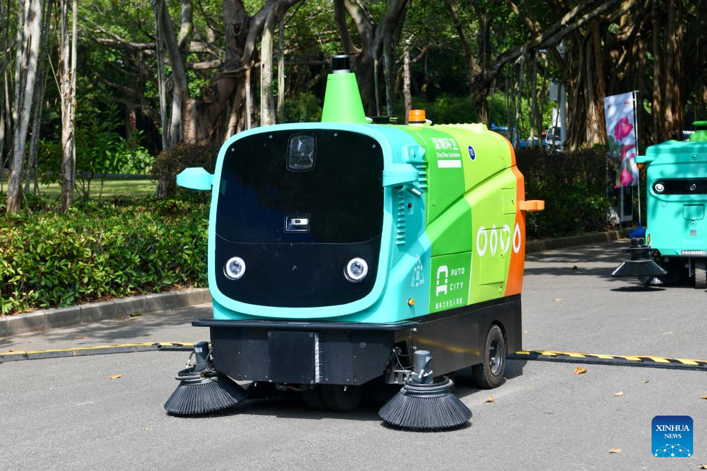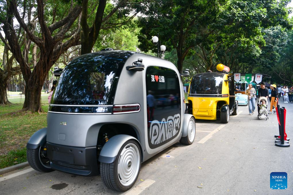 This photo taken on Nov. 11, 2024 shows smart unmanned vehicles at Lianhuashan Park in Shenzhen, south China's Guangdong Province. In various parks across Shenzhen, advanced artificial intelligence applications are ubiquitous, making technologies a part of daily life for the public. (Xinhua/Liang Xu)