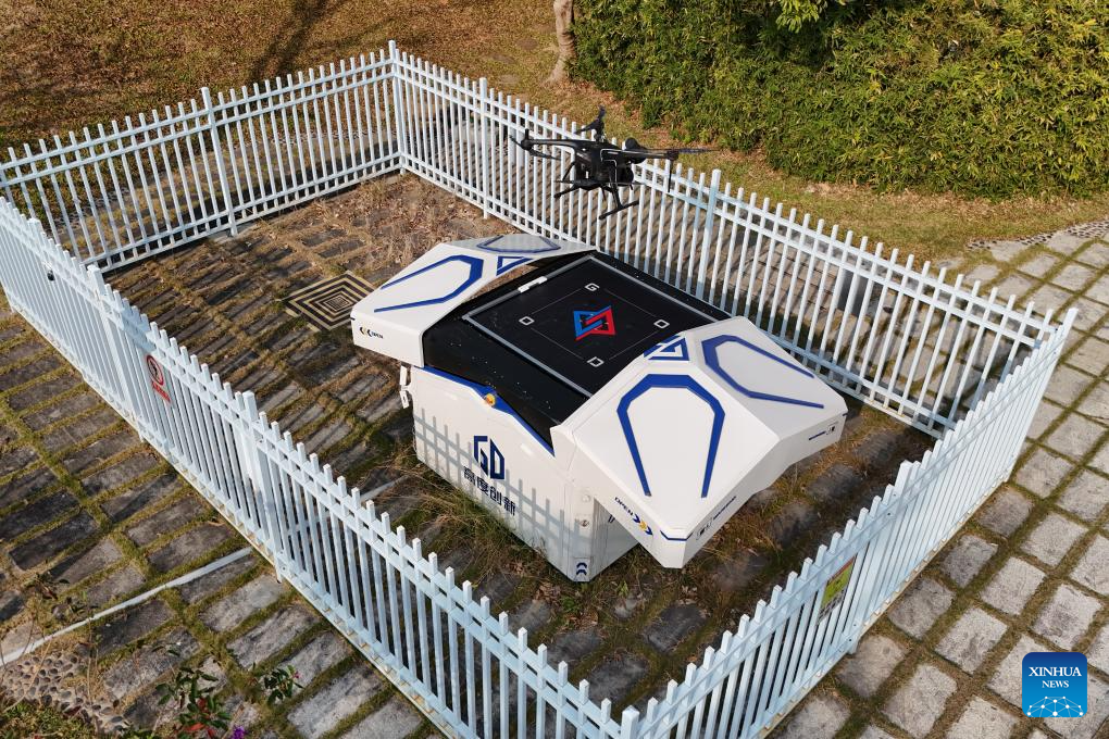 This photo taken on Dec. 28, 2024 shows a drone delivery service station at a park in Shenzhen, south China's Guangdong Province. In various parks across Shenzhen, advanced artificial intelligence applications are ubiquitous, making technologies a part of daily life for the public. (Xinhua/Liang Xu)