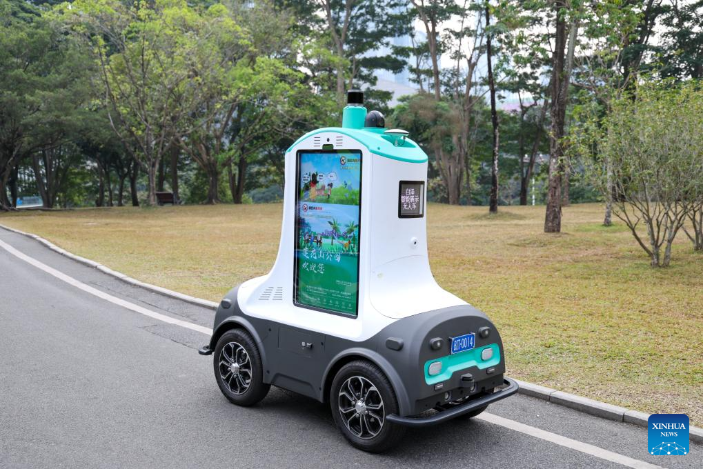 This photo taken on Dec. 27, 2024 shows a smart unmanned vehicle at Lianhuashan Park in Shenzhen, south China's Guangdong Province. In various parks across Shenzhen, advanced artificial intelligence applications are ubiquitous, making technologies a part of daily life for the public. (Xinhua/Liang Xu)