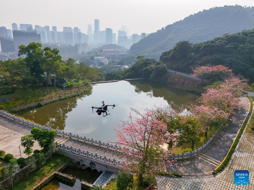 This drone photo taken on Dec. 27, 2024 shows a drone conducting inspection work at a park in Shenzhen, south China's Guangdong Province. In various parks across Shenzhen, advanced artificial intelligence applications are ubiquitous, making technologies a part of daily life for the public. (Xinhua/Liang Xu)