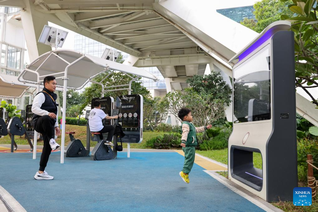People exercise with smart fitness devices at a park in Shenzhen, south China's Guangdong Province, Dec. 27, 2024. In various parks across Shenzhen, advanced artificial intelligence applications are ubiquitous, making technologies a part of daily life for the public. (Xinhua/Liang Xu)
