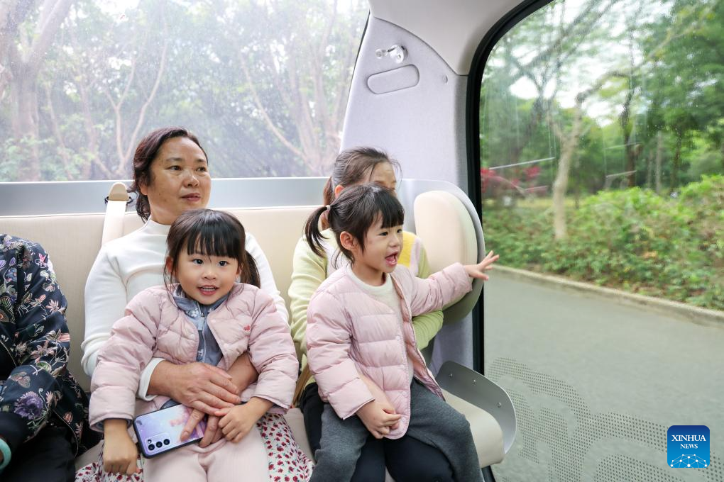 People take an unmanned vehicle tour at Lianhuashan Park in Shenzhen, south China's Guangdong Province, Dec. 27, 2024. In various parks across Shenzhen, advanced artificial intelligence applications are ubiquitous, making technologies a part of daily life for the public. (Xinhua/Liang Xu)