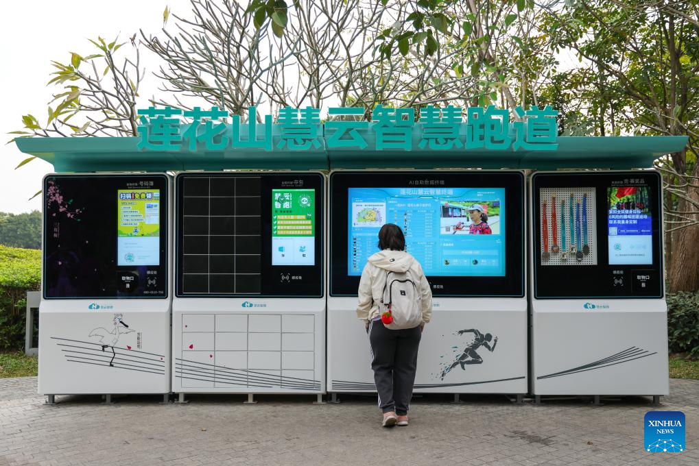 A visitor learns about a smart racing application at Lianhuashan Park in Shenzhen, south China's Guangdong Province, Dec. 27, 2024. In various parks across Shenzhen, advanced artificial intelligence applications are ubiquitous, making technologies a part of daily life for the public. (Xinhua/Liang Xu)