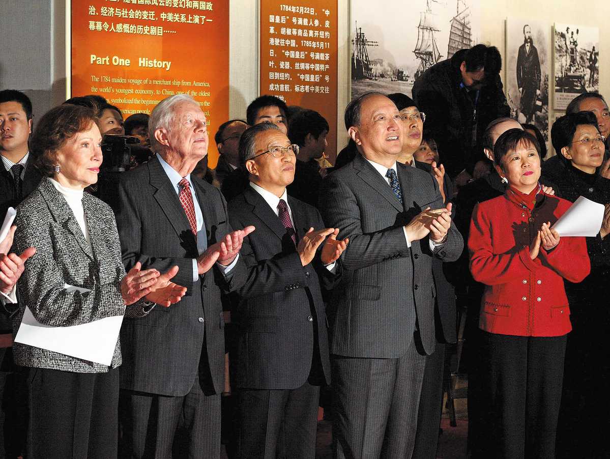 Jimmy Carter (second from left) and his wife Rosalynn (left) attend a photo exhibition marking the 30th anniversary of the establishment of China-US diplomatic relations in Beijing in January 2009. (Wang Jing/China Daily)