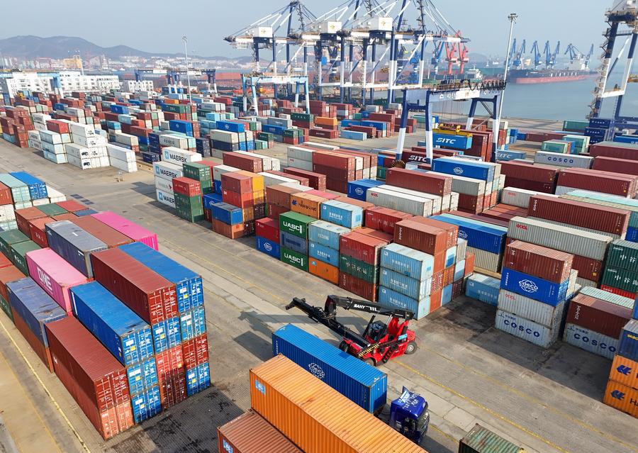 This photo taken on Dec. 10, 2024 shows a view of the international container terminal at Yantai Port in east China's Shandong Province. (Photo by Tang Ke/Xinhua)