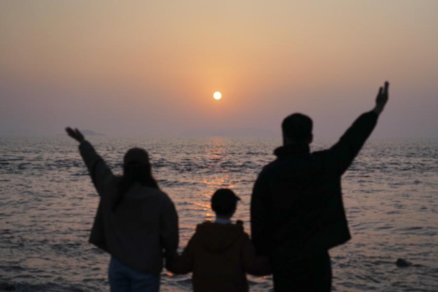 People watch the rising sun at seaside in Rui'an, east China's Zhejiang Province, Jan. 1, 2025. (Photo by Zhuang Yingchang/Xinhua)