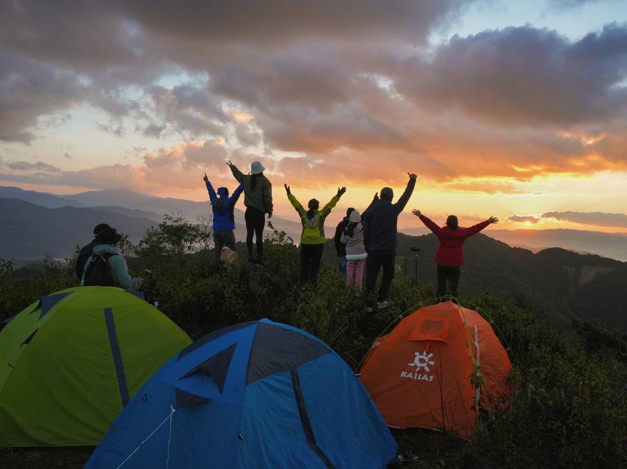 Outdoor enthusiasts watch sunrise in Mangshi City, Dehong Dai and Jingpo Autonomous Prefecture, southwest China's Yunnan Province, Jan. 1, 2025. (Photo by Zhang Rentao/Xinhua)