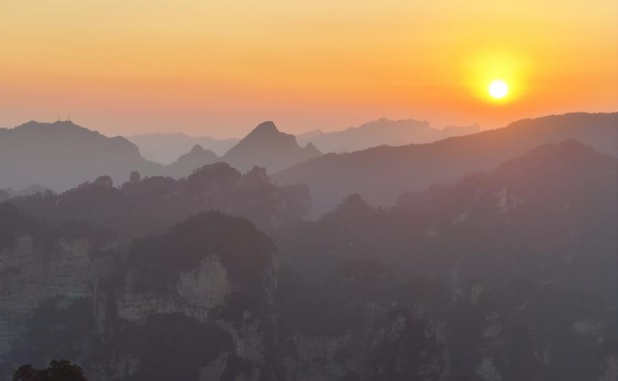 An aerial drone photo shows the sunrise scenery at the Zhangjiajie National Forest Park in Zhangjiajie, central China's Hunan Province, Jan. 1, 2025. (Photo by Wu Yongbing/Xinhua)