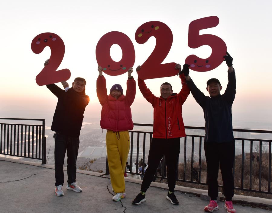 People holding cards of the number 2025 pose for photos at sunrise in Chaohu City, east China's Anhui Province, Jan. 1, 2025. (Photo by Ma Fengcheng/Xinhua)