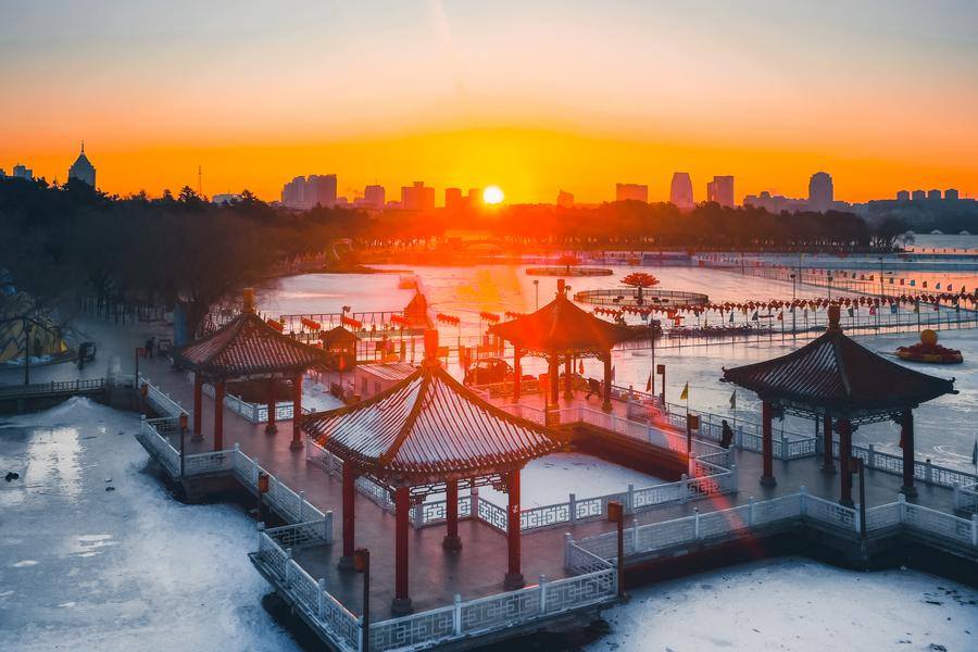 An aerial drone photo shows the sunrise scenery at the Nanhu park in Changchun, northeast China's Jilin Province, Jan. 1, 2025. (Xinhua/Xu Chang)