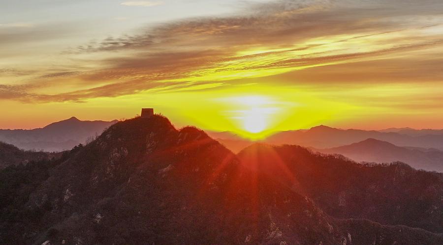 A drone photo shows the sunrise scenery at the Great Wall in Zunhua City, north China's Hebei Province, Jan. 1, 2025. (Photo by Liu Mancang/Xinhua)