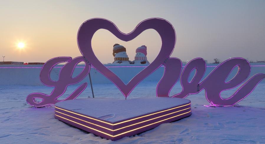 A drone photo shows giant snowmen at sunrise in Songbei District of Harbin, northeast China's Heilongjiang Province, Jan. 1, 2025. (Photo by Zhang Shu/Xinhua)