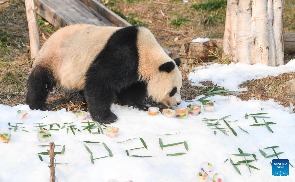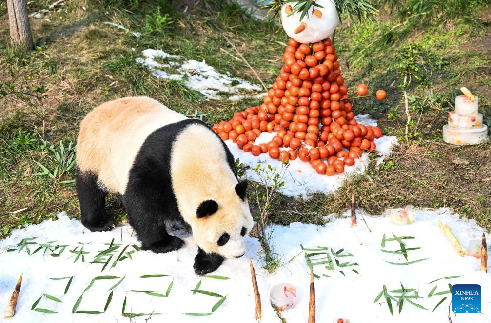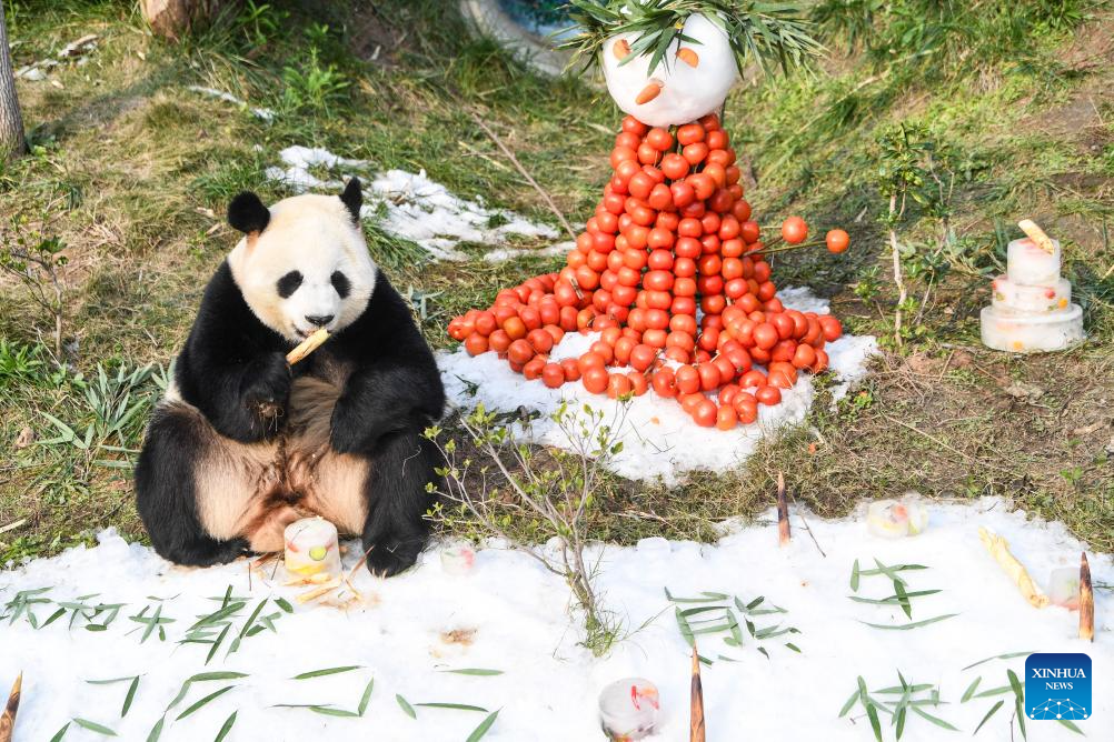 This photo taken on Jan. 1, 2025 shows a panda at Locajoy animal theme park in Yongchuan district of southwest China's Chongqing Municipality. On the first day of the New Year, the Locajoy animal theme park in Chongqing held a celebration for its four giant pandas, marking their first anniversary at the park.