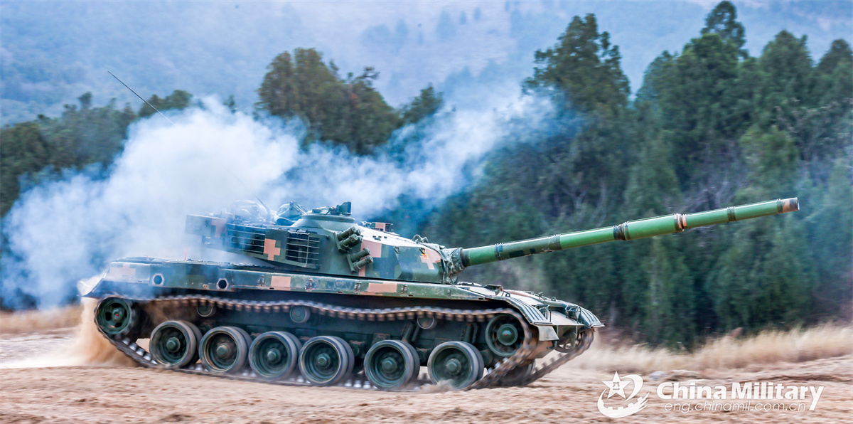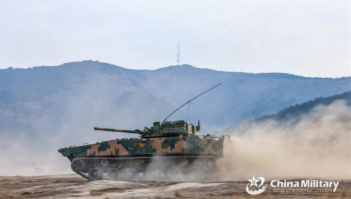A Type 96A main battle tank (MBT) attached to a brigade under the Chinese PLA 71st Group Army rumbles through the field during a maneuver training exercise on December 11, 2024. (eng.chinamil.com.cn/Photo by Lin Min)