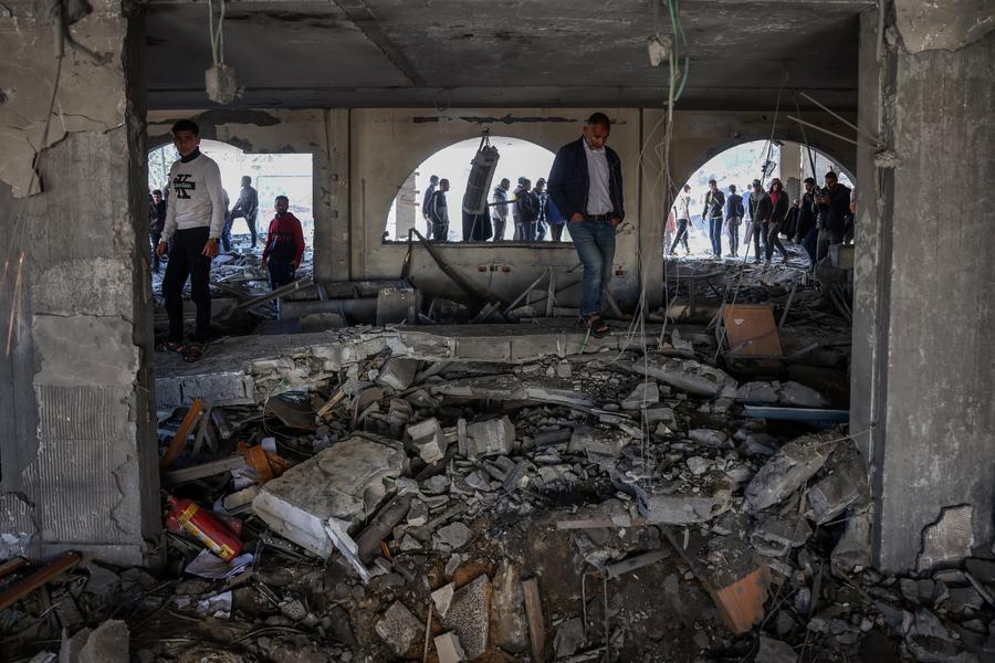 People gather at a building destroyed in an Israeli bombing in the center of the southern Gaza Strip city of Khan Younis, on Jan. 2, 2025. (Photo by Rizek Abdeljawad/Xinhua)