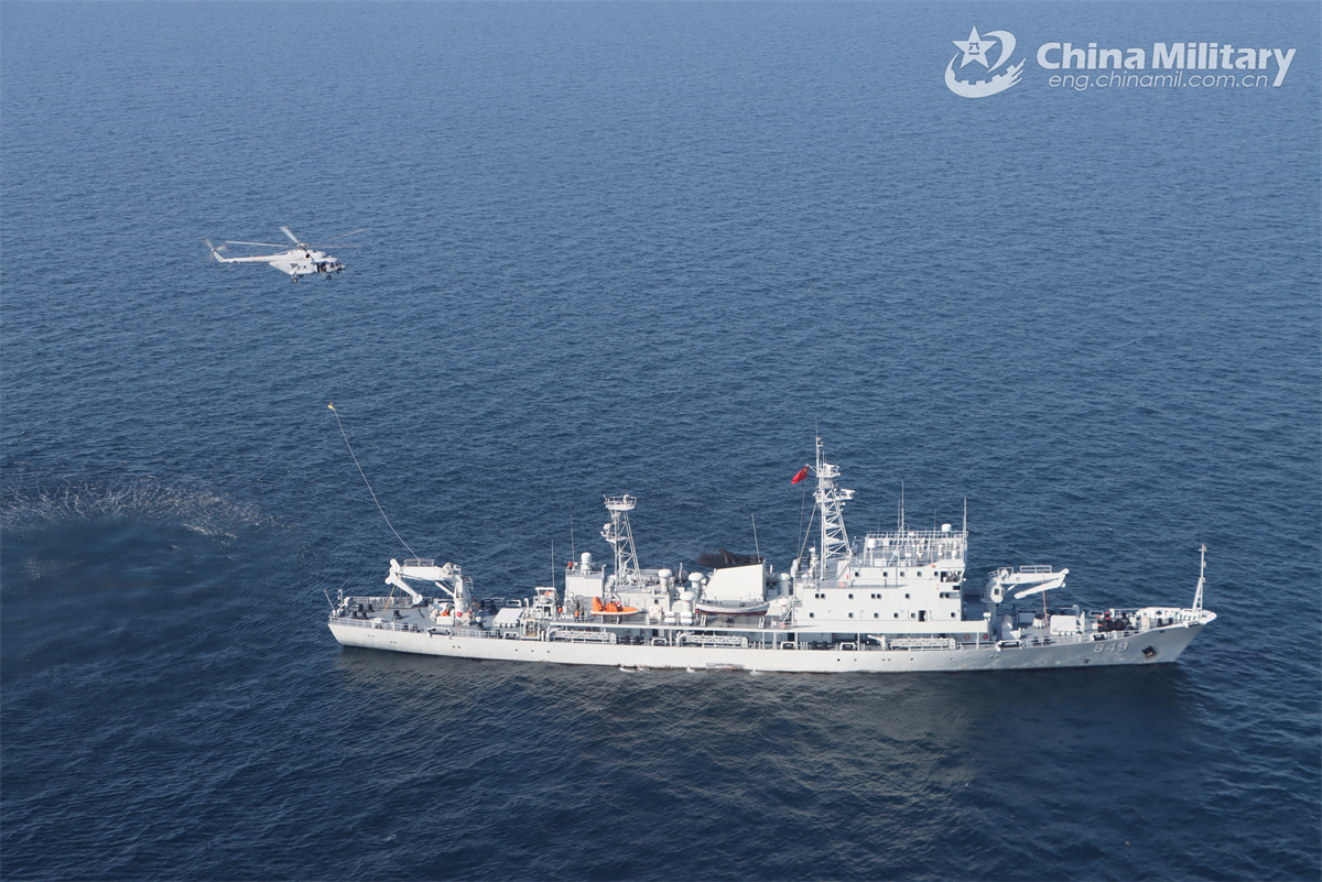An air force helicopter uses rescue hoist to assist in a first-aid operation for the injured personnel on the Type 922 rescue and salvage ship Kanaslake (Hull 849) on November 30, 2024. The ship is attached to a navy unit under the Chinese PLA Northern Theater Command. (eng.chinamil.com.cn/Photo by Cao Hongyang)