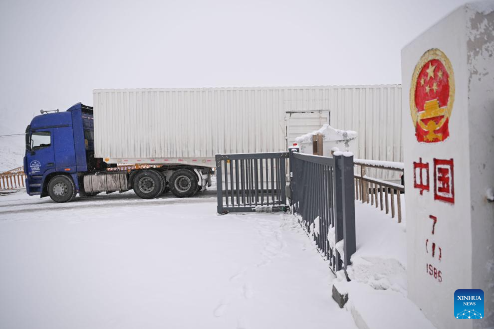 A truck enters China through the Khunjerab Pass in Taxkorgan Tajik Autonomous County, northwest China's Xinjiang Uygur Autonomous Region, Jan. 2, 2025.