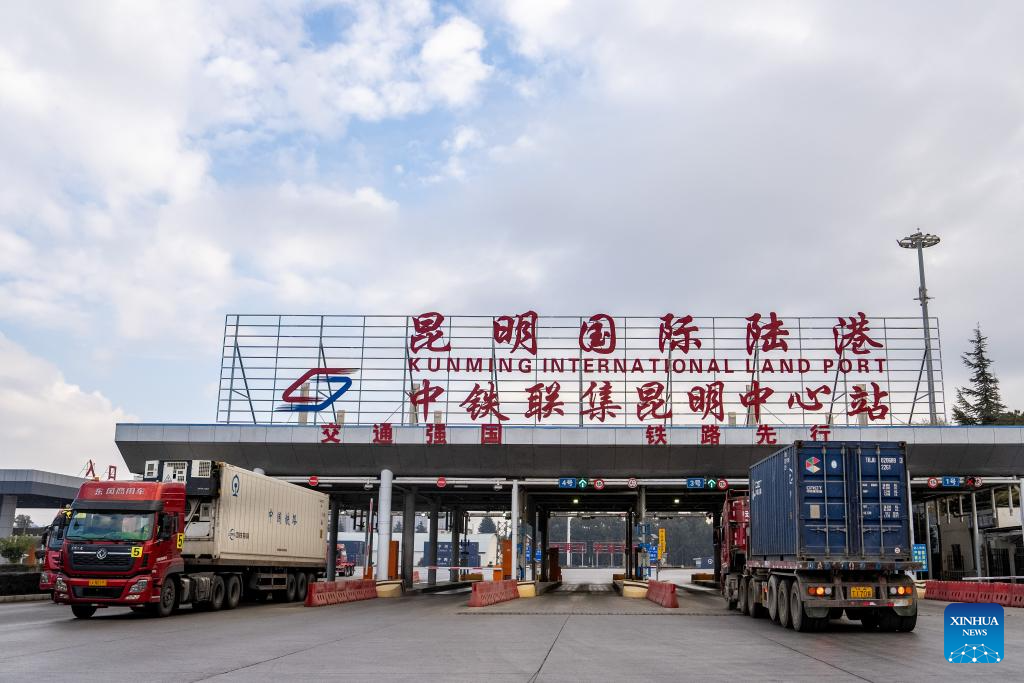 Trucks transport railway containers at the Kunming cargo terminal of China United International Rail Containers Co., Ltd. (CRIntermodal) in Kunming, southwest China's Yunnan Province, on Jan. 2, 2025. Since the full operation of the China-Laos Railway on Dec. 3, 2021, the total cargo throughput of the railway has exceeded 50 million tons, including 11.58 million tons of cross-border goods. (Xinhua/Hu Chao)
