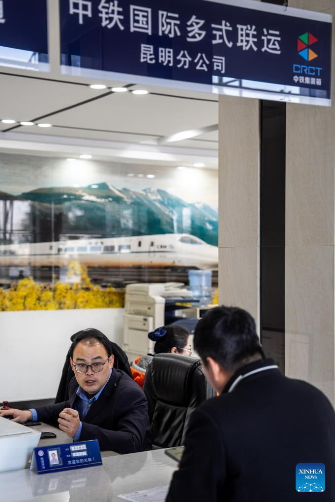 A staff member (L) introduces the freight business of China-Laos Railway to cargo owners at the business hall of the Kunming cargo terminal of China United International Rail Containers Co., Ltd. (CRIntermodal) in Kunming, southwest China's Yunnan Province, on Jan. 2, 2025. Since the full operation of the China-Laos Railway on Dec. 3, 2021, the total cargo throughput of the railway has exceeded 50 million tons, including 11.58 million tons of cross-border goods. (Xinhua/Hu Chao)