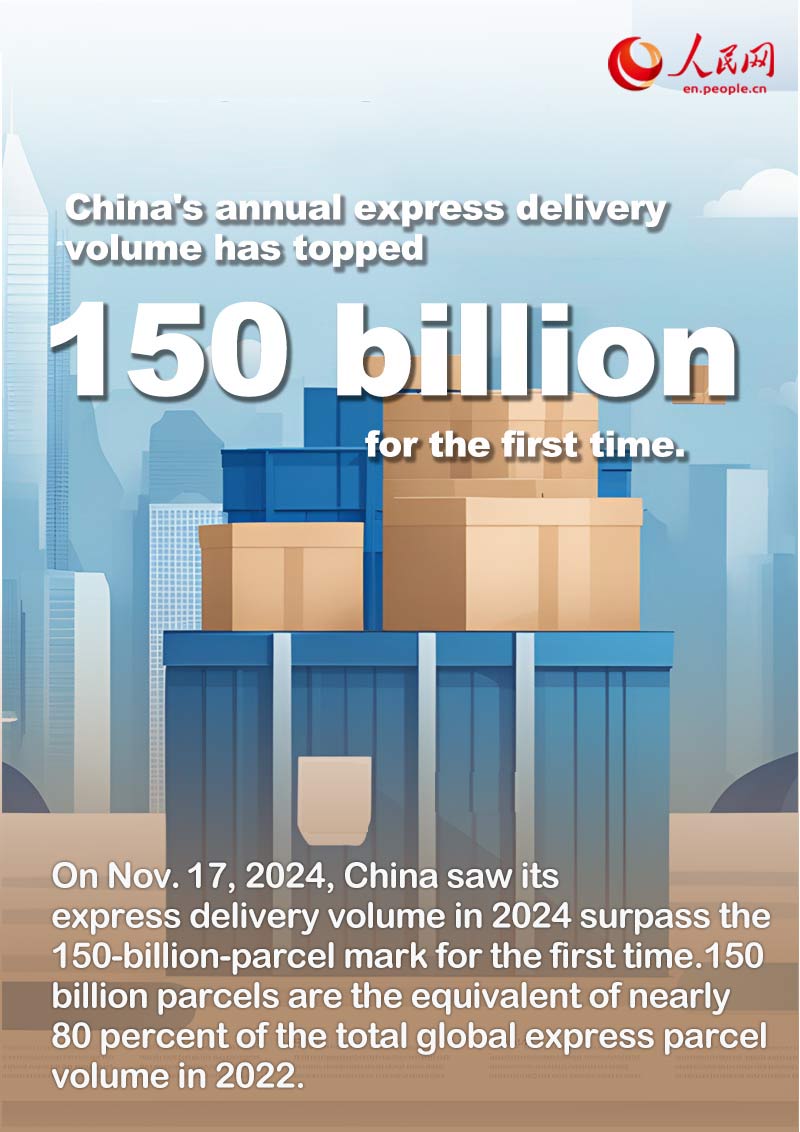 On Nov. 17, 2024, China saw its express delivery volume in 2024 surpass the 150-billion-parcel mark for the first time, setting a new record.