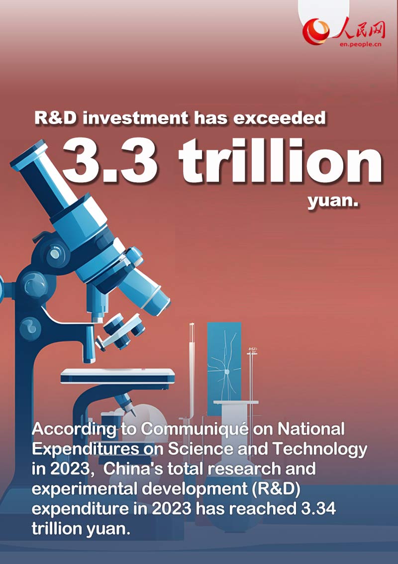 According to Communiqué on National Expenditures on Science and Technology in 2023, China's total research and experimental development (R&D) expenditure in 2023 has reached 3.34 trillion yuan, an increase of 8.4 percent compared to the previous year.