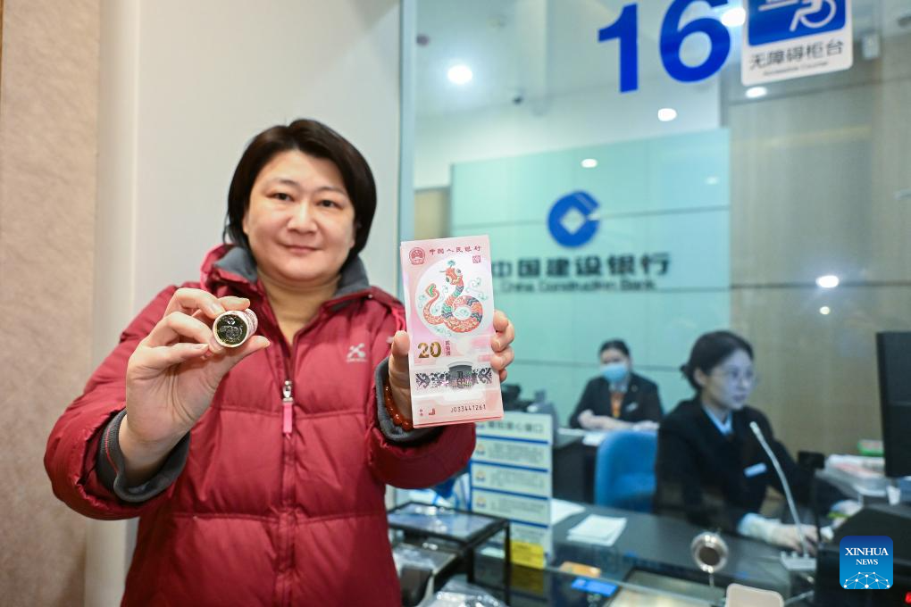 A citizen shows newly exchanged commemorative coins and banknotes in celebration of the upcoming Chinese New Year at a branch of China Construction Bank (CCB) in Beijing, capital of China, Jan. 3, 2025. The exchange of a set of commemorative coins and notes issued by China's central bank to celebrate the upcoming Chinese New Year was started on Friday. (Xinhua/Li Xin)