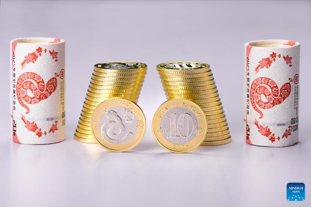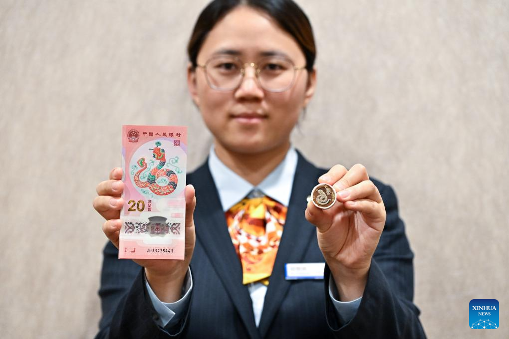 A staff member shows commemorative coins and banknotes in celebration of the upcoming Chinese New Year at a branch of China Construction Bank (CCB) in Beijing, capital of China, Jan. 3, 2025. The exchange of a set of commemorative coins and notes issued by China's central bank to celebrate the upcoming Chinese New Year was started on Friday. (Xinhua/Li Xin)