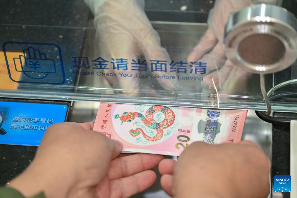 A citizen exchanges commemorative banknotes in celebration of the upcoming Chinese New Year at a branch of China Construction Bank (CCB) in Beijing, capital of China, Jan. 3, 2025. The exchange of a set of commemorative coins and notes issued by China's central bank to celebrate the upcoming Chinese New Year was started on Friday. (Xinhua/Li Xin)