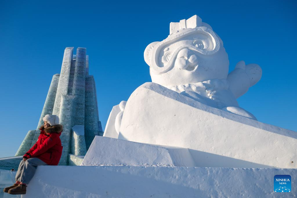 A visitor poses for photos with a snow sculpture of "Nini," mascot of the 2025 Asian Winter Games, at the Harbin Ice-Snow World in Harbin, capital of northeast China's Heilongjiang Province, Jan. 3, 2025. Harbin, with many snow sculptures across the city, has emerged as one of China's top winter travel destinations, attracting tourists from around the globe. (Xinhua/Zhang Tao)