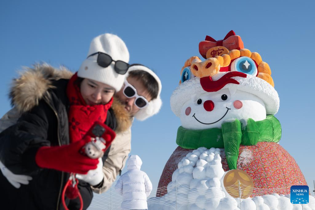 People pose for photos with snowmen "Dongdong" and "Beibei" in Harbin, capital of northeast China's Heilongjiang Province, Jan. 3, 2025. Harbin, with many snow sculptures across the city, has emerged as one of China's top winter travel destinations, attracting tourists from around the globe. (Xinhua/Xie Jianfei)