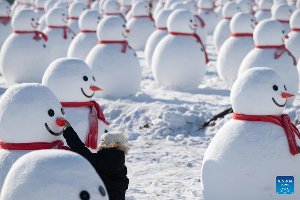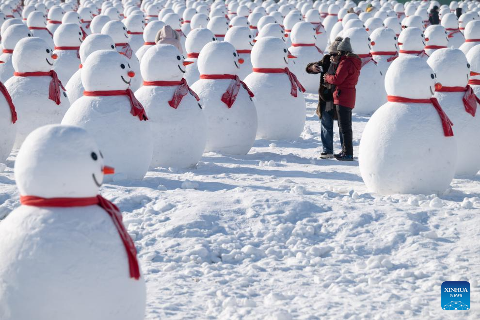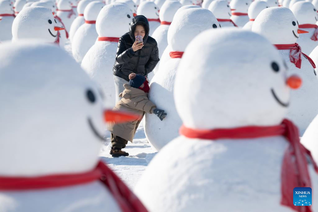 People pose for photos with snowmen at a farm of Beidahuang Group in Harbin, capital of northeast China's Heilongjiang Province, Jan. 4, 2025. Harbin, with many snow sculptures across the city, has emerged as one of China's top winter travel destinations, attracting tourists from around the globe. (Xinhua/Zhang Tao)