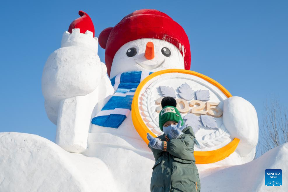 A boy poses for photos with a snowman at an ice and snow amusement park in Harbin, capital of northeast China's Heilongjiang Province, Jan. 4, 2025. Harbin, with many snow sculptures across the city, has emerged as one of China's top winter travel destinations, attracting tourists from around the globe. (Xinhua/Zhang Tao)
