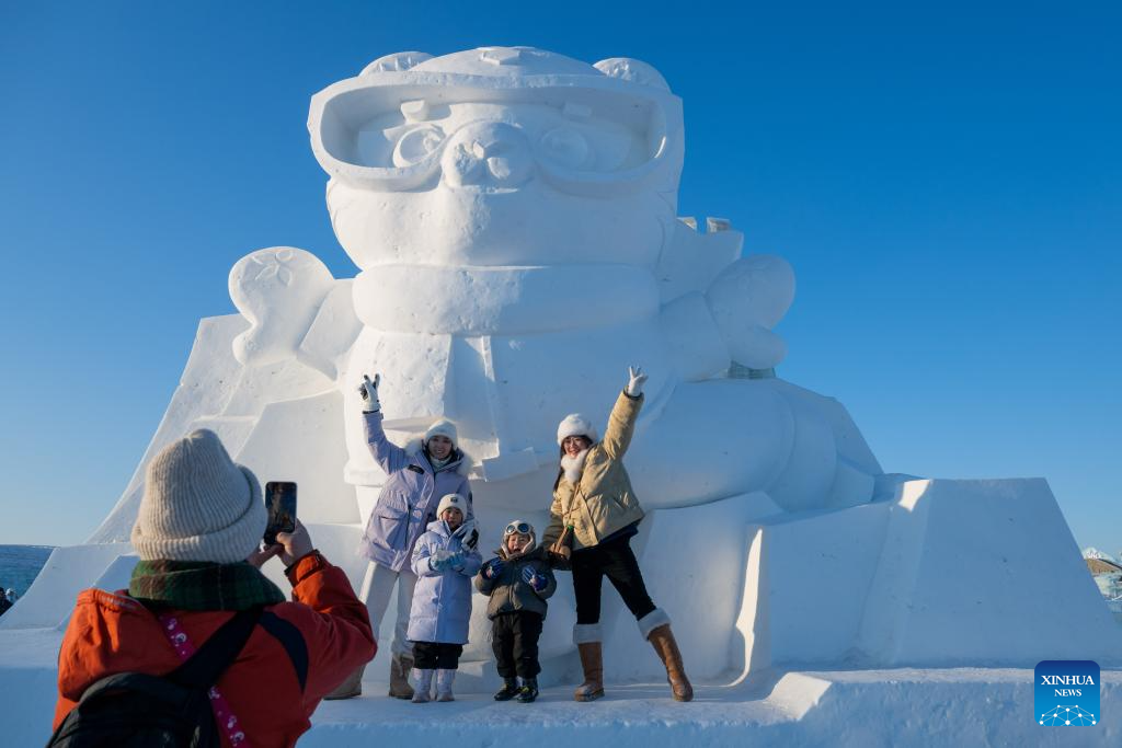 People pose for photos with a snow sculpture of "Binbin," mascot of the 2025 Asian Winter Games, at the Harbin Ice-Snow World in Harbin, capital of northeast China's Heilongjiang Province, Jan. 3, 2025. Harbin, with many snow sculptures across the city, has emerged as one of China's top winter travel destinations, attracting tourists from around the globe. (Xinhua/Zhang Tao)