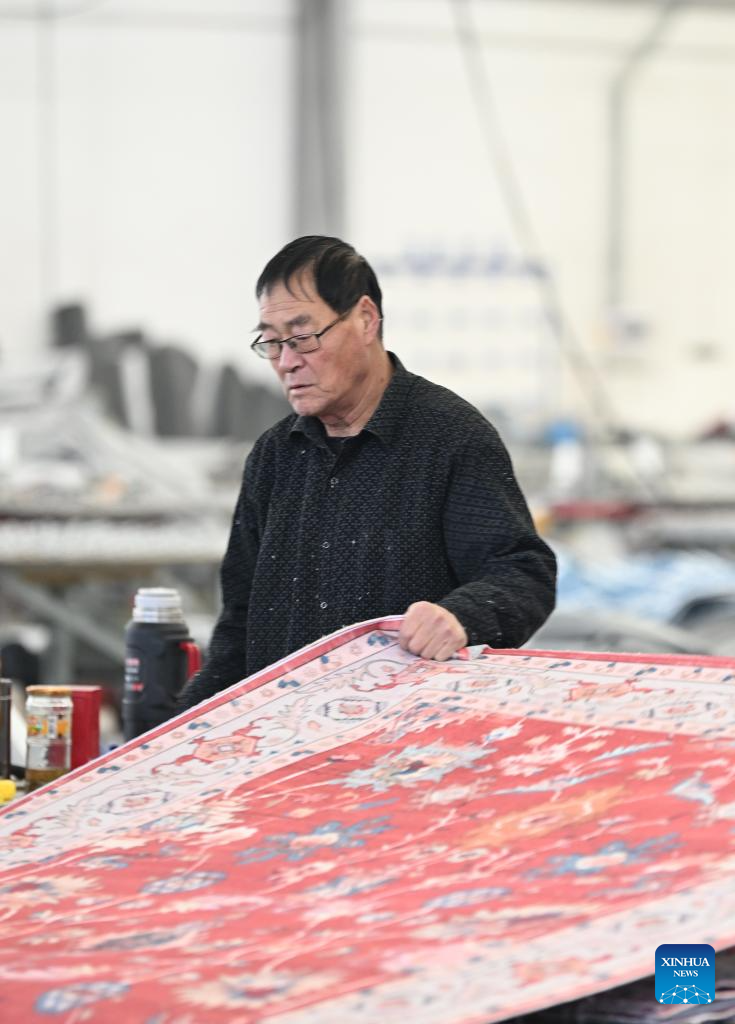 A worker pulls carpets at a carpet company in Cuihuangkou Town, Tianjin, north China, on Jan. 3, 2025. Carpet enterprises are busy with production for orders before the upcoming Spring Festival holidays in Cuihuangkou Town, which is known as the "carpet town" and has more than 100 years of carpet production history. At present, there are more than 1,200 carpet enterprises in the town, with an annual carpet production of hundreds of millions of pieces, and 25,000 local employees, accounting for about 50 percent of the town's population. (Xinhua/Li Ran)