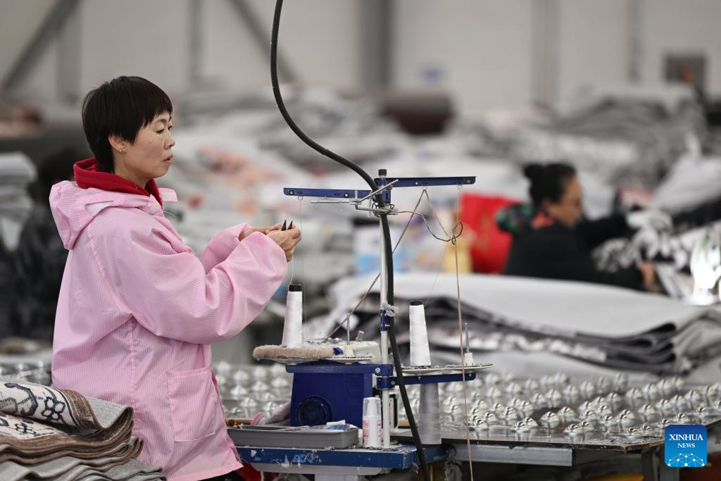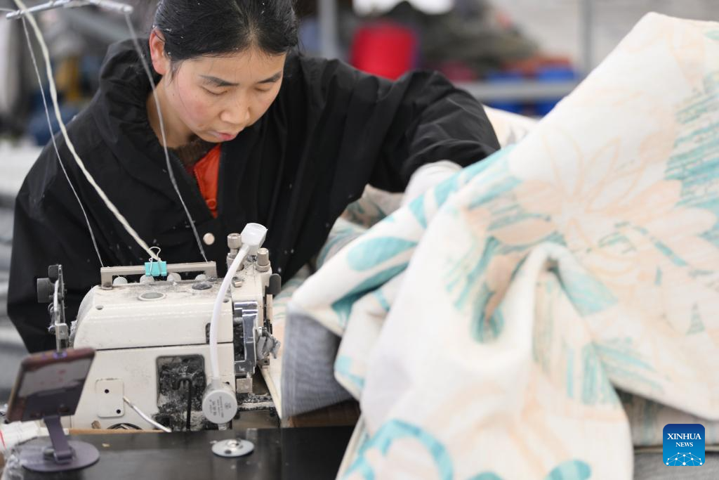 A worker lays out threads on the sewing machine at a carpet company in Cuihuangkou Town, Tianjin, north China, on Jan. 3, 2025. Carpet enterprises are busy with production for orders before the upcoming Spring Festival holidays in Cuihuangkou Town, which is known as the "carpet town" and has more than 100 years of carpet production history. At present, there are more than 1,200 carpet enterprises in the town, with an annual carpet production of hundreds of millions of pieces, and 25,000 local employees, accounting for about 50 percent of the town's population. (Xinhua/Li Ran)