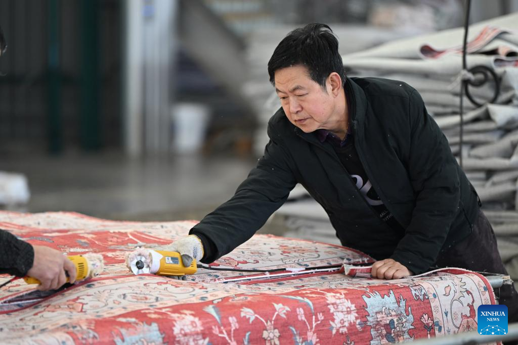 A worker cuts carpets at a carpet company in Cuihuangkou Town, Tianjin, north China, on Jan. 3, 2025. Carpet enterprises are busy with production for orders before the upcoming Spring Festival holidays in Cuihuangkou Town, which is known as the "carpet town" and has more than 100 years of carpet production history. At present, there are more than 1,200 carpet enterprises in the town, with an annual carpet production of hundreds of millions of pieces, and 25,000 local employees, accounting for about 50 percent of the town's population. (Xinhua/Li Ran)