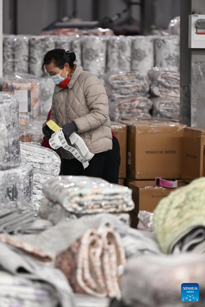 A worker attaches labels to carpets exported to the United States at a carpet company in Cuihuangkou Town, Tianjin, north China, on Jan. 3, 2025. Carpet enterprises are busy with production for orders before the upcoming Spring Festival holidays in Cuihuangkou Town, which is known as the "carpet town" and has more than 100 years of carpet production history. At present, there are more than 1,200 carpet enterprises in the town, with an annual carpet production of hundreds of millions of pieces, and 25,000 local employees, accounting for about 50 percent of the town's population. (Xinhua/Li Ran)