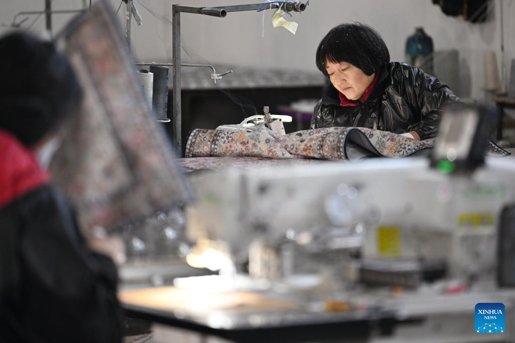 A worker overlocks the carpet at a carpet company in Cuihuangkou Town, Tianjin, north China, on Jan. 3, 2025. Carpet enterprises are busy with production for orders before the upcoming Spring Festival holidays in Cuihuangkou Town, which is known as the "carpet town" and has more than 100 years of carpet production history. At present, there are more than 1,200 carpet enterprises in the town, with an annual carpet production of hundreds of millions of pieces, and 25,000 local employees, accounting for about 50 percent of the town's population. (Xinhua/Li Ran)